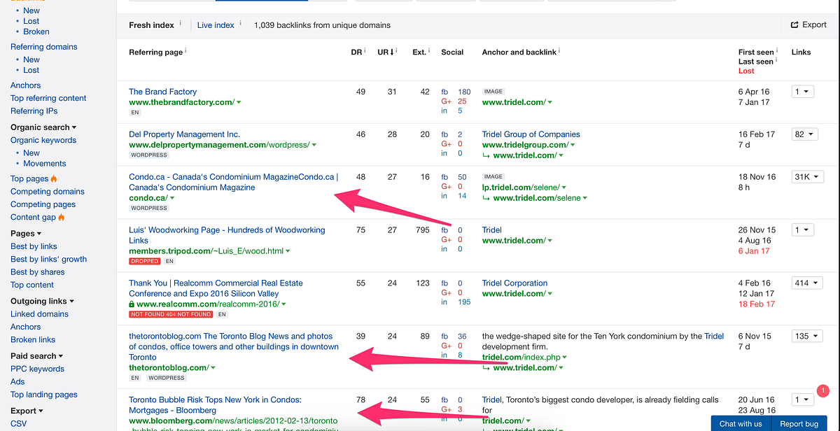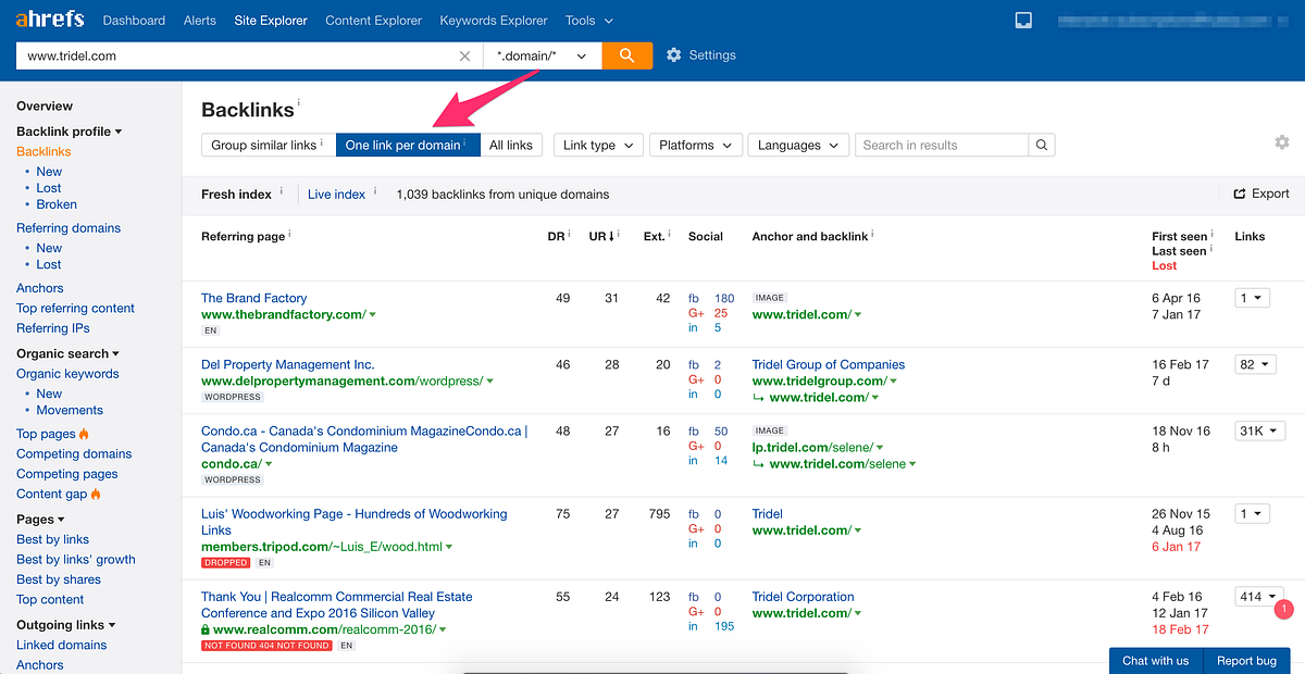 You will be taken to a page that shows you all of the people that have linked to your competition. This list can be long and full of duplicates, so I like to scope the results to “only one per domain”.