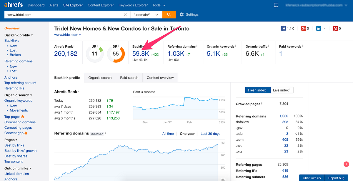 Next, go to https://ahrefs.com and put your first competitor’s domain into the search box, and make sure that the*/domain*modifier is selected, and wait for the results. What you are looking at is your competitor’s link profile. From there, click on the “Backlinks” section.